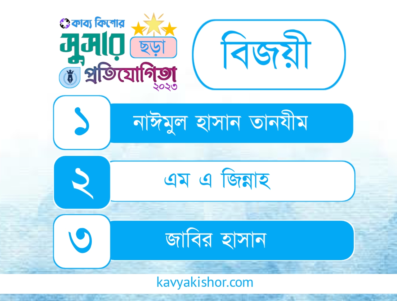 কাব্য কিশোর-সুসার ছড়া প্রতিযোগিতা-২০২৩ হলো কাব্য কিশোর ও সুসাহিত্যের রণাঙ্গন ( সুসার ) কর্তৃক আয়োজিত একটি ছড়া প্রতিযোগিতা। প্রতিযোগিতার অফিশিয়াল লগো বিজয়ী বিজয়ী ১. নাঈমুল হাসান তানযীম ২. এম এ জিন্নাহ ৩. জাবির হাসান প্রতিযোগিতা সম্পর্কিত যোগাযোগ info@kavyakishor.com 2023-02-27